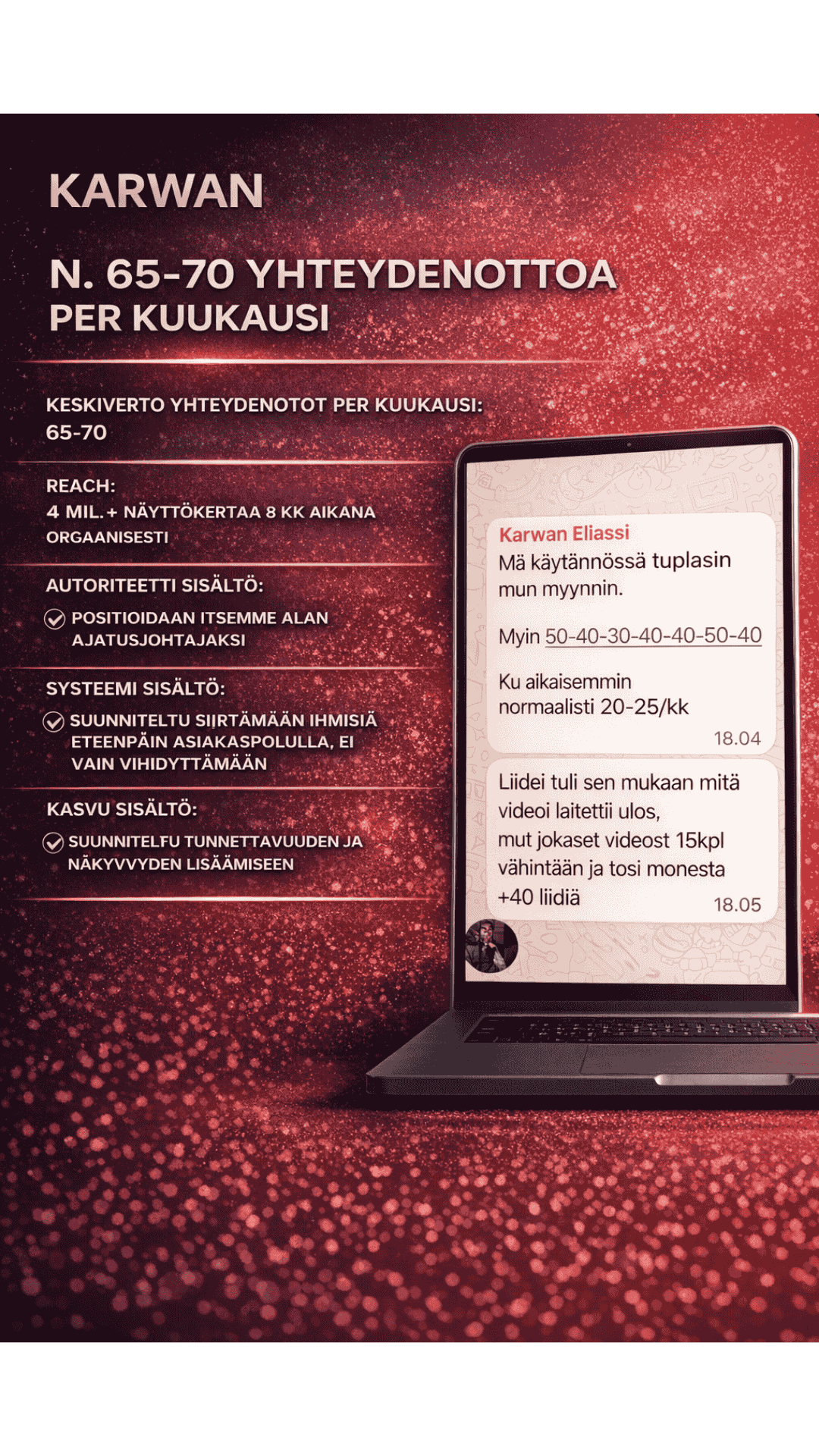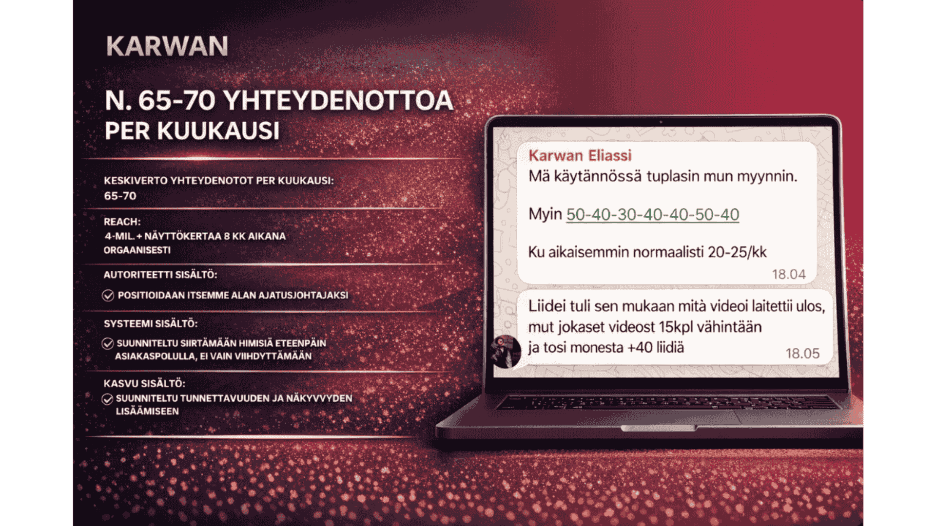Rakennamme teille ensin selkeän asiakashankinnan mallin sen mukaan, mikä sopii juuri teidän bisnekseen parhaiten. Sen jälkeen käsikirjoitamme, kuvaamme, editoimme ja julkaisemme kuukausittain lyhytvideosisältöä, rakennamme mainonnan rakenteen ja seuraamme jatkuvasti mikä toimii, mikä ei ja mitä kannattaa tehdä seuraavaksi.