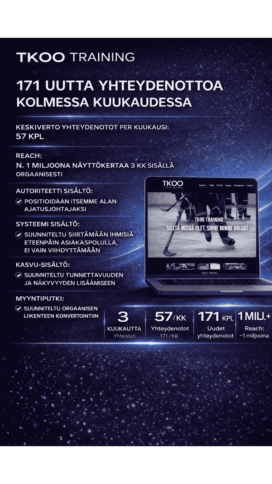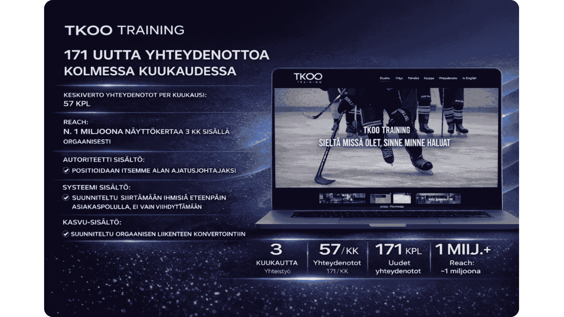 Seuraamme jatkuvasti, mistä yhteydenotot oikeasti tulevat, mikä sisältö ja mainonta toimii parhaiten ja mihin kannattaa panostaa lisää. Näin tekeminen ei perustu arvailuun, vaan dataan.