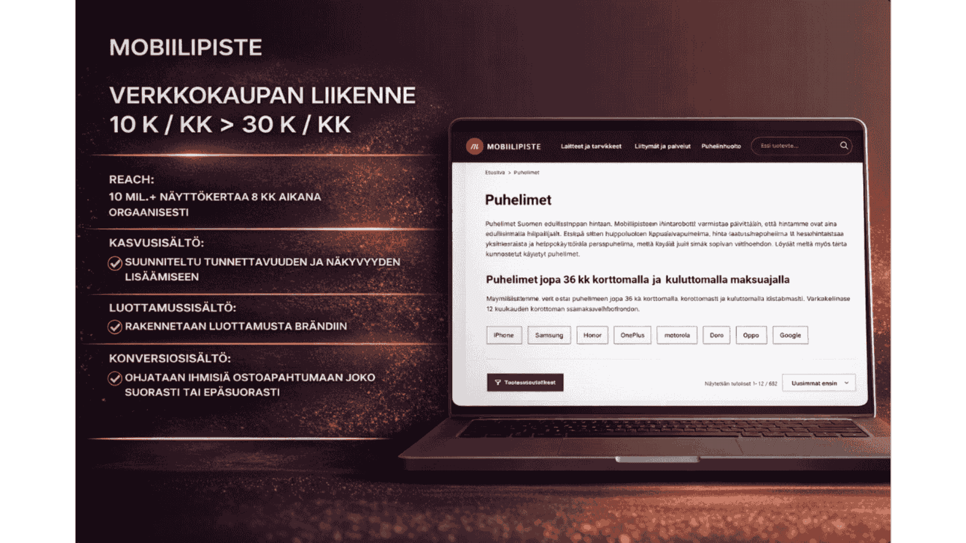 Eli käytännössä yhdistämme strategian, sisällöntuotannon, mainonnan ja optimoinnin yhdeksi kokonaisuudeksi.