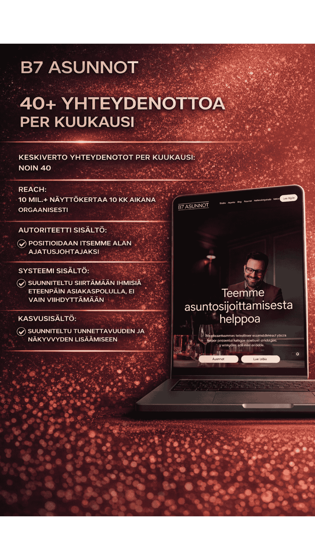 Meidän rooli ei ole vain tehdä markkinointia, vaan toimia teille kasvun strategisena kumppanina niin, että tekemisen tavoite ei jää näkyvyyteen, vaan muuttuu oikeiksi yhteydenotoiksi ja lopulta lisää kaupaksi.